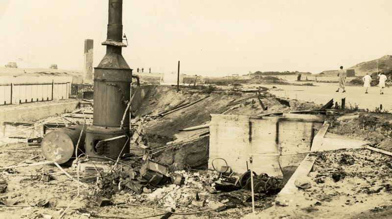 September 26, 1936 became the most fateful day in Bandon history. Bandon already had a long history of devastating fires, but the extraordinarily dry season of 1936 rendered the city especially vulnerable to the conflagration that broke out that morning and visited a holocaust upon the community that beggared everything that had gone before. Fed by a strong east wind, the fire barely gave citizens a chance to grab a few precious possessions and flee to the beach for safety. By nightfall the entire city was in flames and when morning broke on September 27, Bandon was little more than a heap of ashes and the twisted concrete shells of formerly proud and prosperous buildings.