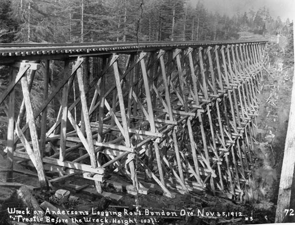 “The wreck occurred about 9 o’clock this morning. It was the first loaded train to cross the big trestle, the logging road being now under construction. The trestle is about 300 feet long and at its highest point is 104 feet above the bed of the creek. Where the train went through, it was 70 feet above the ground.