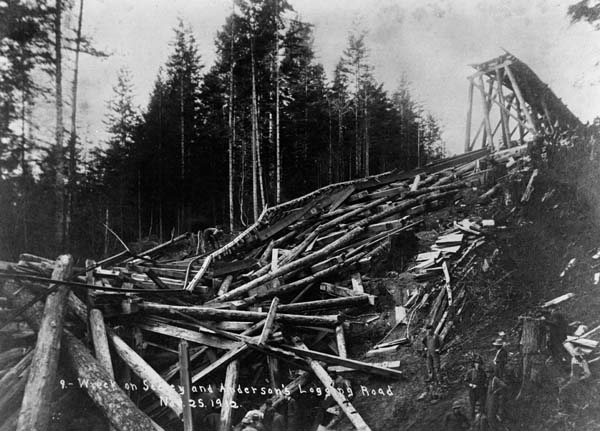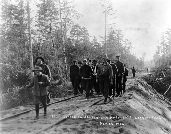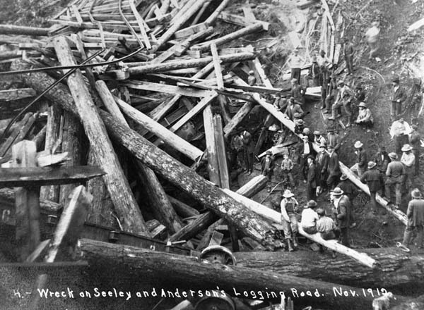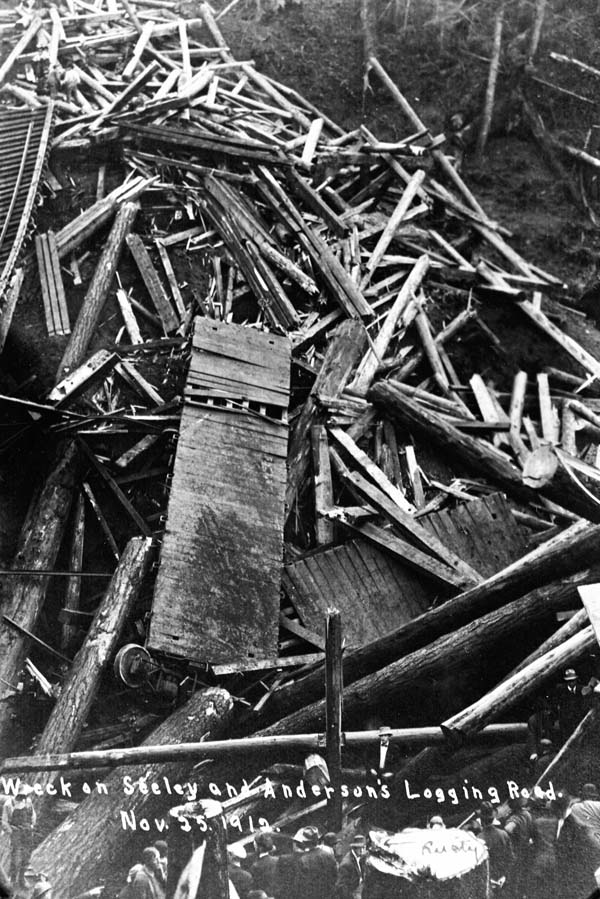 “All the camps and places shut down and men rushed out and tried to do what they could. The cars, logs, engines and bridge timbers were reduced to a huge pile of broken and twisted iron, splinters and broken wood. The trestle simply collapsed underneath the weight of the train.